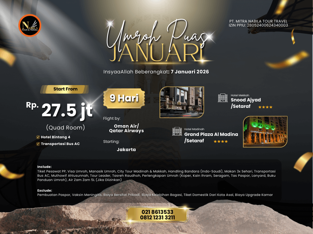 Syarat dan ketentuan ini dibuat untuk kenyamanan bersama dan dapat diperbarui sewaktu-waktu sesuai kebijakan perusahaan dan regulasi perjalanan umroh dari pemerintah Indonesia maupun Arab Saudi.