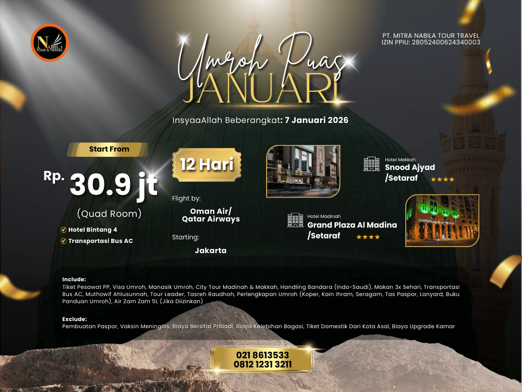 Syarat dan ketentuan ini dibuat untuk kenyamanan bersama dan dapat diperbarui sewaktu-waktu sesuai kebijakan perusahaan dan regulasi perjalanan umroh dari pemerintah Indonesia maupun Arab Saudi.